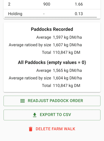 To export a farm walk to a CSV, scroll to the bottom of the page and click "Export to CSV". This will download a CSV file to your device.