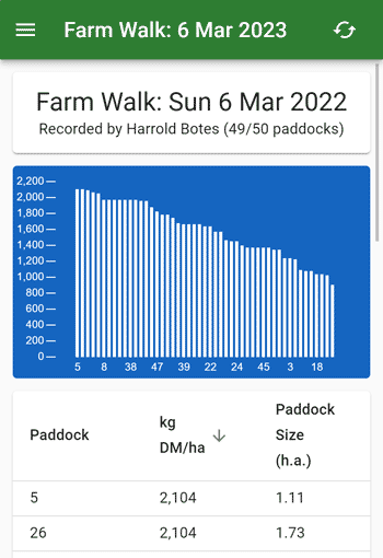 Under the chart is a list of paddocks and their readings. Click on the "kg DM/ha" or "Paddock Size" headings to change the table sort order.