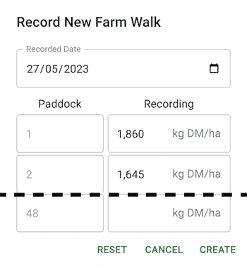 A new page will show where you can enter the reading for each paddock. If you are entering data for a previous day, you can change the date at the top. Click the "Create" button at the bottom when you have completed.