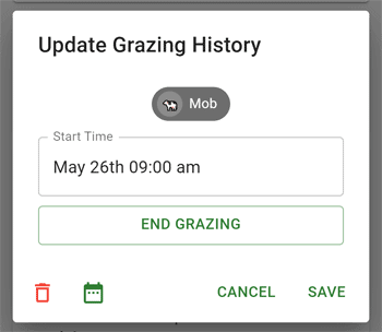 You can tap on date inputs to change the date and time of the start/end of a grazing. Clicking the "End Grazing" button will complete the grazing and clicking the "Re-Open Grazing" button will make it like it was never completed. Make sure to click the "Save" button when you are done editing.