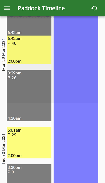 The paddock timeline displays the grazing history in a timeline view. This allows you to easily go back and see what paddock was being grazed on a specific date.