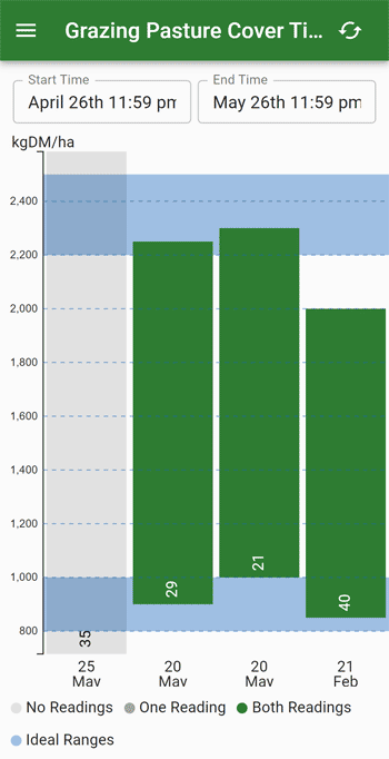 If you have enabled pasture cover recording, you can view the pasture cover timeline. This shows the pasture cover for each paddock over time. It can also show grazings that did not have a pasture cover reading.