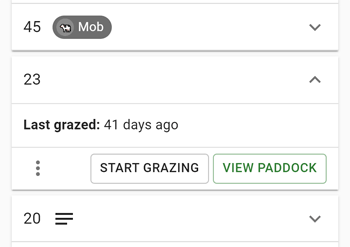 To create a grazing go to the paddock list/queue, expand the paddock you want to start grazing and click "Start Grazing" - the paddock will be moved to the top of the queue and the mob will be displayed beside it.