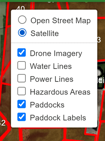 The bottom group of layers are the extra layers. These are layers that you can add on top of the base layer. You can have multiple extra layers visible at a time. The layers "Paddocks" and "Paddock Labels" are always visible.