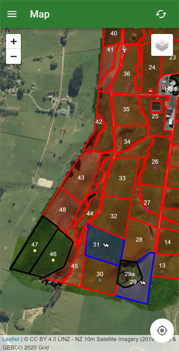 | 🟥 Red boundary (with a paddock number/name) | These are your paddocks, tap on them to open up a menu for the paddock |