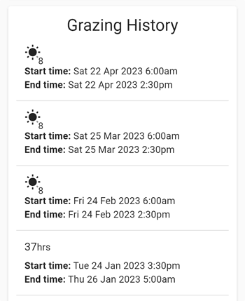 Each block is a grazing which displays the start and end time and the duration.