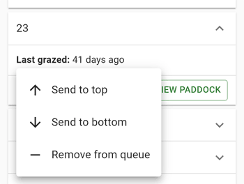 If you have a paddock that can't be grazed (maybe due to crops or other reasons), you can remove it from the queue by expanding the paddock and clicking the three dots at the bottom left. In this menu, you can click "Remove from queue" to remove it from the queue.