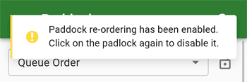 By default, the queue is locked to prevent accidental changes. To unlock the queue, click the padlock button in the top right corner. This will allow you to drag and drop paddocks to change the order. You will see this message when unlocking: