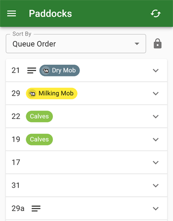 At the top of the queue, you can change the order that paddocks are displayed in. This is only visual and does not change the order of the paddocks in the queue.